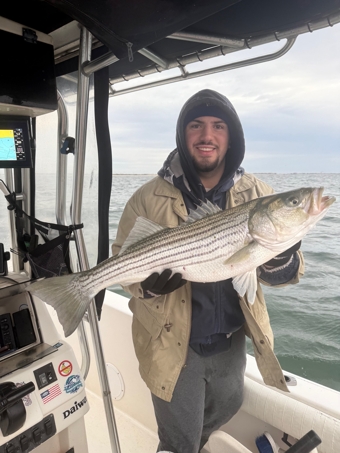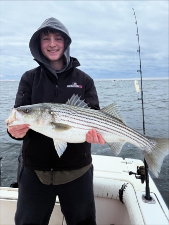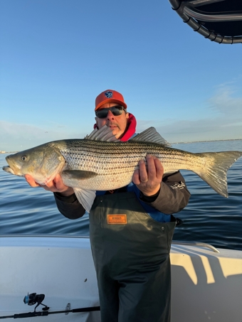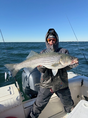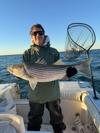 Incredible striped bass action right in our own back yard. Big fish to 40+ lbs hitting live bunker as well as top water artificials. There is bait everywhere and tons of marine life too - whales, sharks. More and more slot fish being caught as the migration from east to west contunues. Epic bite.